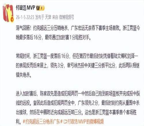 媒体人付政浩老师则认为,此役可谓“荡气回肠!约克超远三分压哨绝杀,广东宏远无奈吞下赛季主场首败。浙江男篮今晚最多落后16分,最终通过加时赛1分险胜对手。”