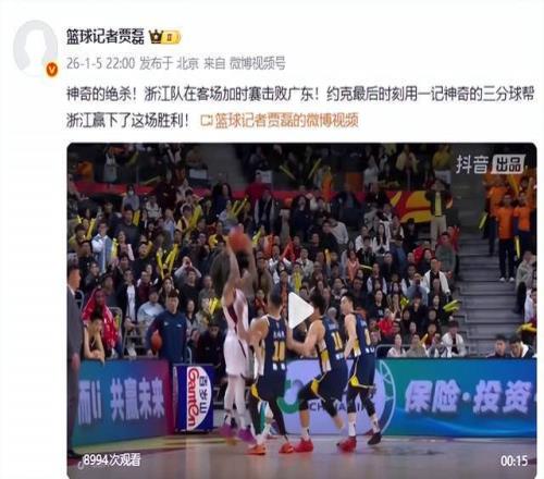 篮球记者贾磊老师则表示:“神奇的绝杀!浙江队在客场加时赛击败广东!约克最后时刻用一记神奇的三分球帮浙江赢下了这场胜利!”