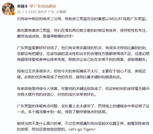 而作为广东媒体人,麦穗丰老师就不客气了,直接点出了广东男篮的问题所在,“广东男篮需要好好总结了,他们有非常多赢球的机会,有很多次终结比赛的时刻,但都没有把握住,在进攻端的坚决性和出手的合理性方面都做得很不足,总是幻想有超级球星或者神仙球来兜底,那就会让自己处在非常不利的局面,很容易翻车。”