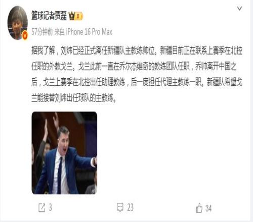 只是如今根据篮球记者贾磊报道:“新疆男篮目前正在联系上赛季在北控男篮任职的外教戈兰,戈兰此前一直在乔尔杰维奇的教练团队任职,乔帅离开中国之后,戈兰上赛季在北控出任助理教练,后一度担任代理主教练一职,新疆男篮希望戈兰能接替刘炜出任球队的主教练。”