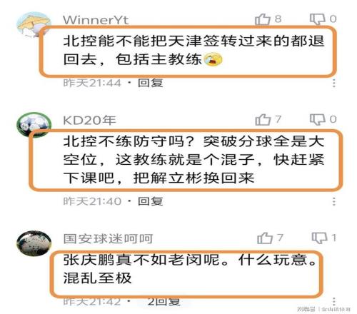 “北控这赛季怎么了?上赛季还打到了季后赛第二轮,这赛季到现在没进季后赛。”;“有前途,可能是个好球员,但是不一定是个好教练。”;“张庆鹏不适合当教练。”;“北控脸都不要了,再输就只能输四川了,然后没得输了。”;“张庆鹏在场外明显心慌了,影响了场上队员的情绪。”;“在10分钟的一节里还能丢40分真的神了。”;“北控没钱找个好点的主教练吗?”……