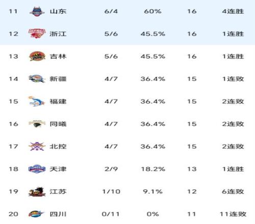 前十一轮过后,广厦队、上海队、北京队、广东队分列积分榜前四名,巧合的是,以上四队的战绩都是9胜2负。