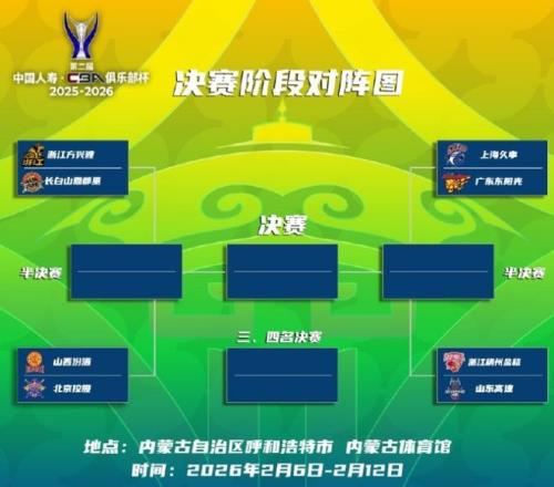 CBA官方公告写道:“第二届CBA俱乐部杯决赛阶段揭幕战,定于2月6日16:00打响,2月12日19:30进行总决赛,期间八强球队浙江、山东、上海、广东、广厦、吉林、山西、北控将在内蒙古自治区呼和浩特市,按照对阵进行单败淘汰赛(共8场比赛),按排名办法最终产生本届杯赛所有名次。”