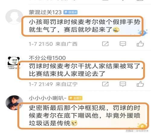 有几位现场球迷,赛后也道出真相。“小孩哥罚球时候麦考尔做个假摔手势就生气了,赛后就吵起来了”;“罚球时候麦考尔干扰人家结果被骂了,比赛结束找人家理论去了”;“史密斯最后那个冲框犯规,罚球的时候麦考尔在底下嘲讽他,毕竟外援喷垃圾话是传统。”。