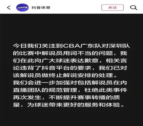 另外一方面,还有球迷把这个事情反映到平台官方这边,目前官方的负责人也已经站出来表态回应说针对这一名解说员的行为进行停职处理。另外他也表示当事人应该是不知情的说出这番话,没想到伤害了广东球迷的感情。当然面对平台的这一番回应,相信有些球迷应该还是不满意的。如果此人不了解广东球迷的话,不可能说出这番非常难听的话,所以我们还是希望接下来平台能够针对这名解说员永不录用。