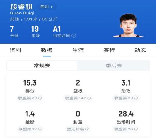 其中,一年级新秀段睿骐表现最为抢眼。赛季至今(今晚比赛之前),场均可以拿到15.3分3.1次助攻2个篮板。