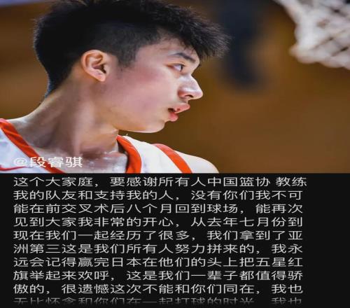 遗憾的是,段睿骐在此后对阵约旦男篮的亚洲杯三、四名决赛当中,为了一个出界球重重甩出场外,拼断了右膝前交叉韧带,最后经诊断赛季报销要休养40周。
