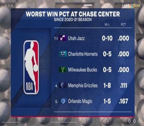 在本场比赛开始之前,转播方晒出了20-21赛季以来大通中心客队最差战绩排列,其中,爵士已经在大通中心遭遇到10连败,5个赛季以来,球队就没有在大通中心赢过球。算上本场比赛的失利,爵士已经11连败。