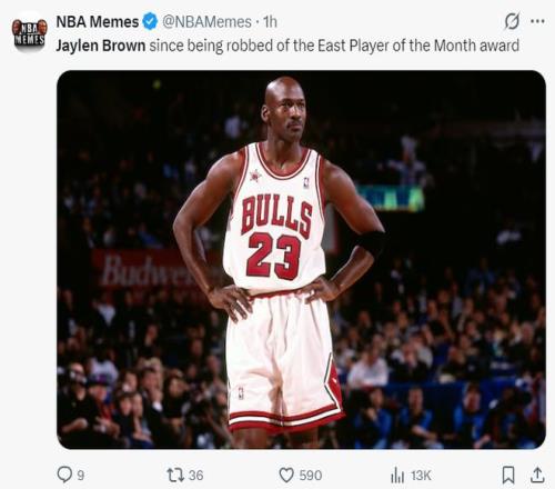 美媒NBA Memes写道:当杰伦-布朗的月最佳球员被抢走后,他就化身迈克尔-乔丹了。