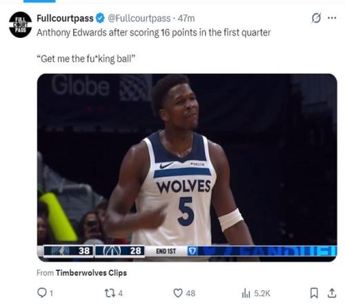 北京时间1月5日,森林狼141-115大胜奇才拿到二连胜。这场比赛森林狼在客场碾碎了奇才,首节森林狼就领先10分,第三节更是一波35-21直接将比赛打入垃圾时间,狼王爱德华兹三节35分打卡下班,不过此役爱德华兹在赛后遭到了一些质疑。