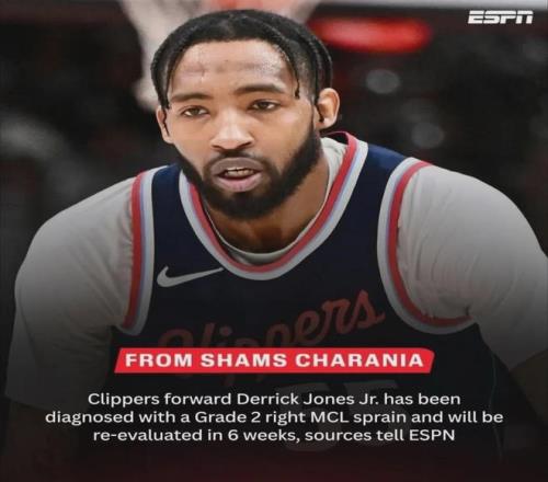爆料王Shams:小琼斯被诊断为右膝内侧副韧带二级扭伤,六周后重新评估。
