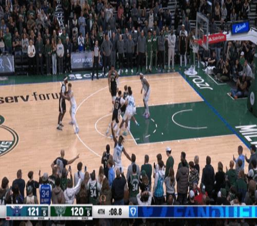 比赛只剩8秒时,雄鹿前场边线球发出,字母哥与小波特打出“二人转”配合,由字母哥完成空接扣篮准绝杀。