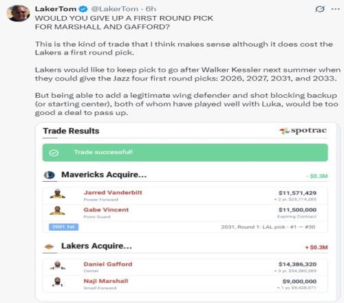湖人媒体Laker Tom写道:你们愿意放弃一个首轮签来换马绍尔、加福德吗?这笔交易我认为是合理的,尽管湖人会失去一个首轮签。