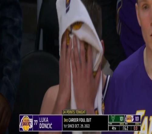 雄鹿关键一攻,东契奇对波特三分犯规,后者三罚两中,东契奇6犯离场,这是他职业生涯第三次六犯离场,湖人落后两分,在下场之后,东契奇愤怒摔护膝表达了不满。最后,詹姆斯执行最后一攻,但是球被切掉,最终湖人遗憾输球。