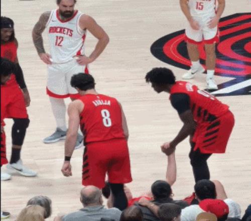 亚当斯一旁等待杨瀚森起身,随后友好询问状况