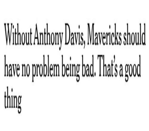 对独行侠球迷而言,唯一的慰藉或许是:球队本赛季剩余的比赛,表现越差反而越好。本赛季,戴维斯出战时,独行侠的战绩为10胜10负;他缺阵时,球队战绩仅为4胜14负。而戴维斯缺阵期间,独行侠的战绩换算成整季仅为18胜,这对球队而言,反而是件好事。