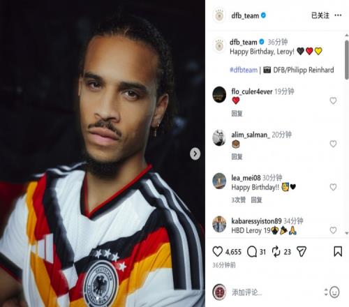 德国队官方社媒晒出萨内的照片,配文:“生日快乐,勒鲁瓦!”