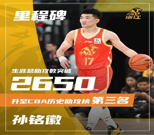孙铭徽助攻总数超越郭艾伦,上升至CBA历史助攻榜第三位。