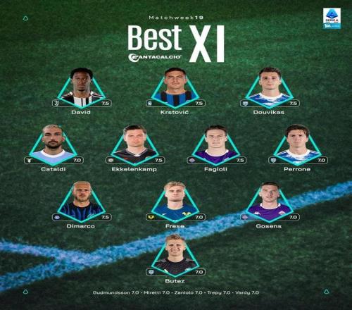 意甲第19轮最佳阵容:乔纳森戴维、迪马尔科、法乔利入选