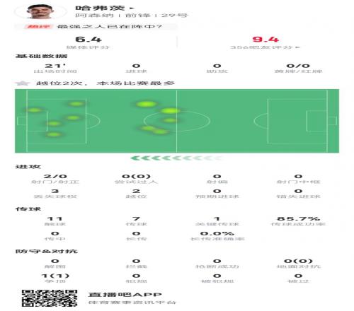 体育播报1月12日宣 阿森纳在本轮足总杯4-1击败朴茨茅斯,哈弗茨伤愈复出完成赛季第2次出场,本场数据如下: