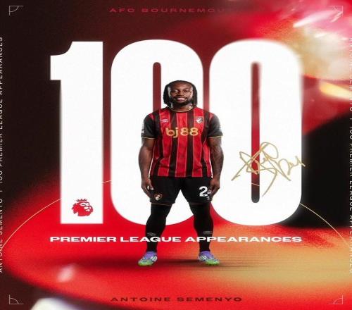 本场比赛对阵阿森纳,塞门约将首发出战,根据统计,这是他在英超当中的第100场比赛,伯恩茅斯官方也在社交媒体上晒出海报纪念这一成就。