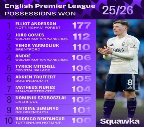 体育播报1月10日宣 数据机构squawka统计了本赛季英超赢得球权情况,诺丁汉森林中场埃利奥特·安德森独自领跑。