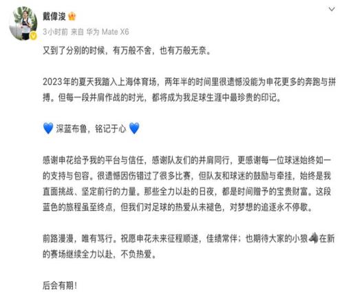 在申花官宣前的两个小时,戴伟浚已经在自己的社交媒体与俱乐部做了告别。