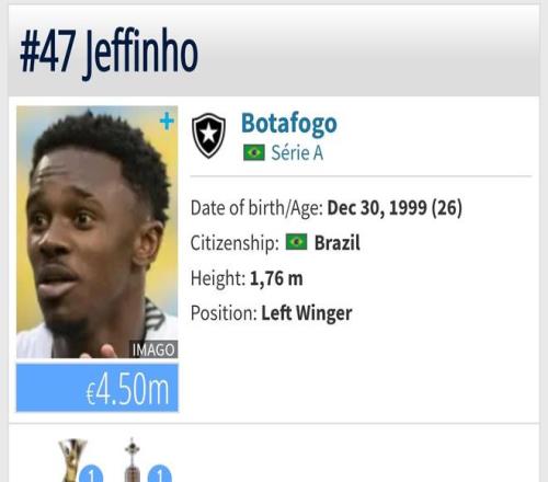 现年26岁的热菲尼奥德转身价达450万欧,场上司职左边锋,此前曾在法甲里昂队效力两个赛季,2024赛季加盟巴甲的博塔弗戈并效力至今。2025赛季,热菲尼奥代表博塔弗戈出场26场,攻进2球并送出4次助攻。